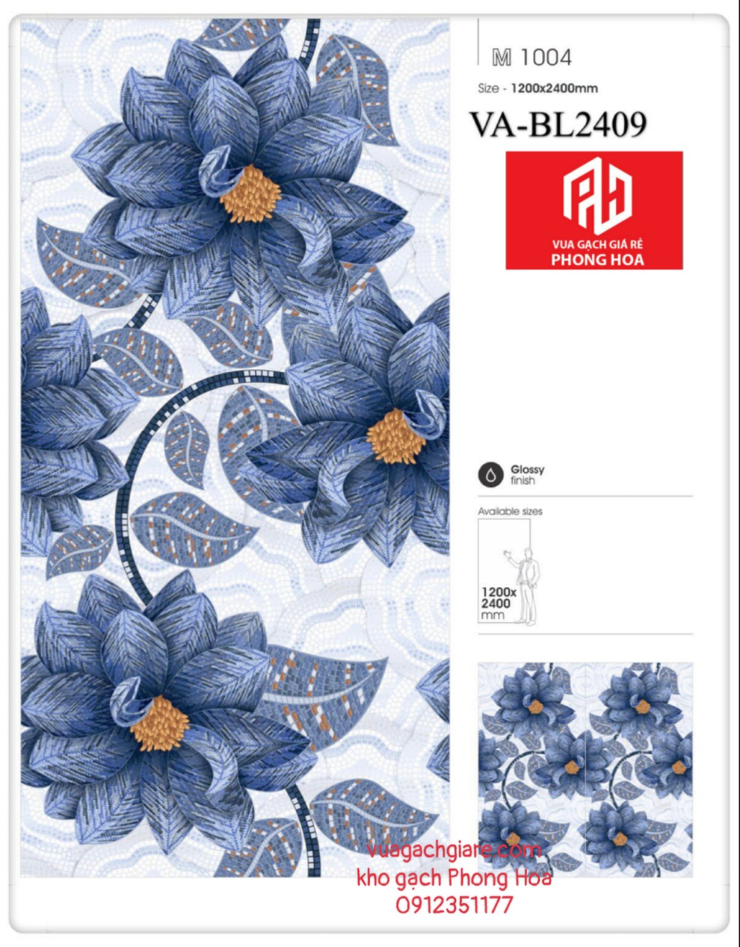 Gạch ốp lát 120x240 Ấn Độ decor hoa màu xanh dương