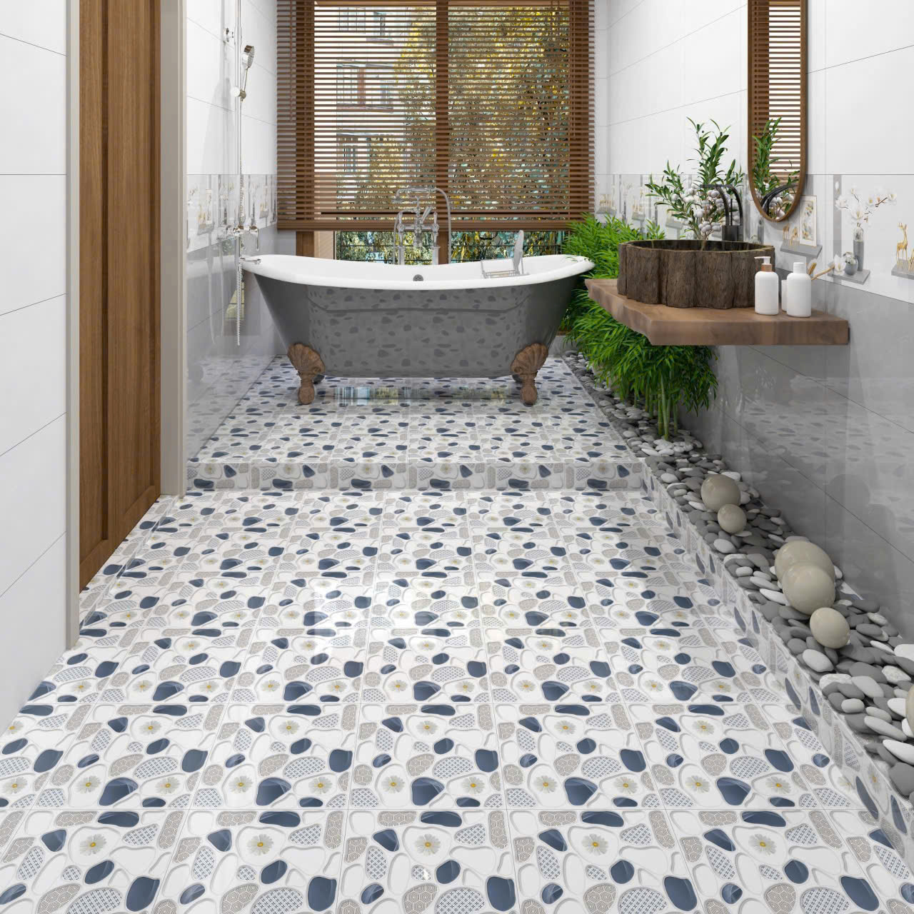 Phối Cảnh Gạch Men 30x30 Ốp Lát Toilet sỏi đá