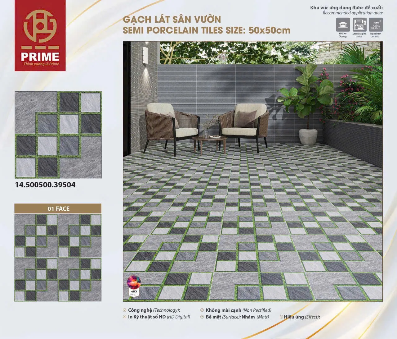 - Gạch Đá 50x50 Ốp Lát Sân Vườn có bề mặt mờ - nhám ->> có khả năng chống trơn trượt và chống thấm tốt cho khu vực ẩm thấp của Không Gian Nội Ngoại Thất