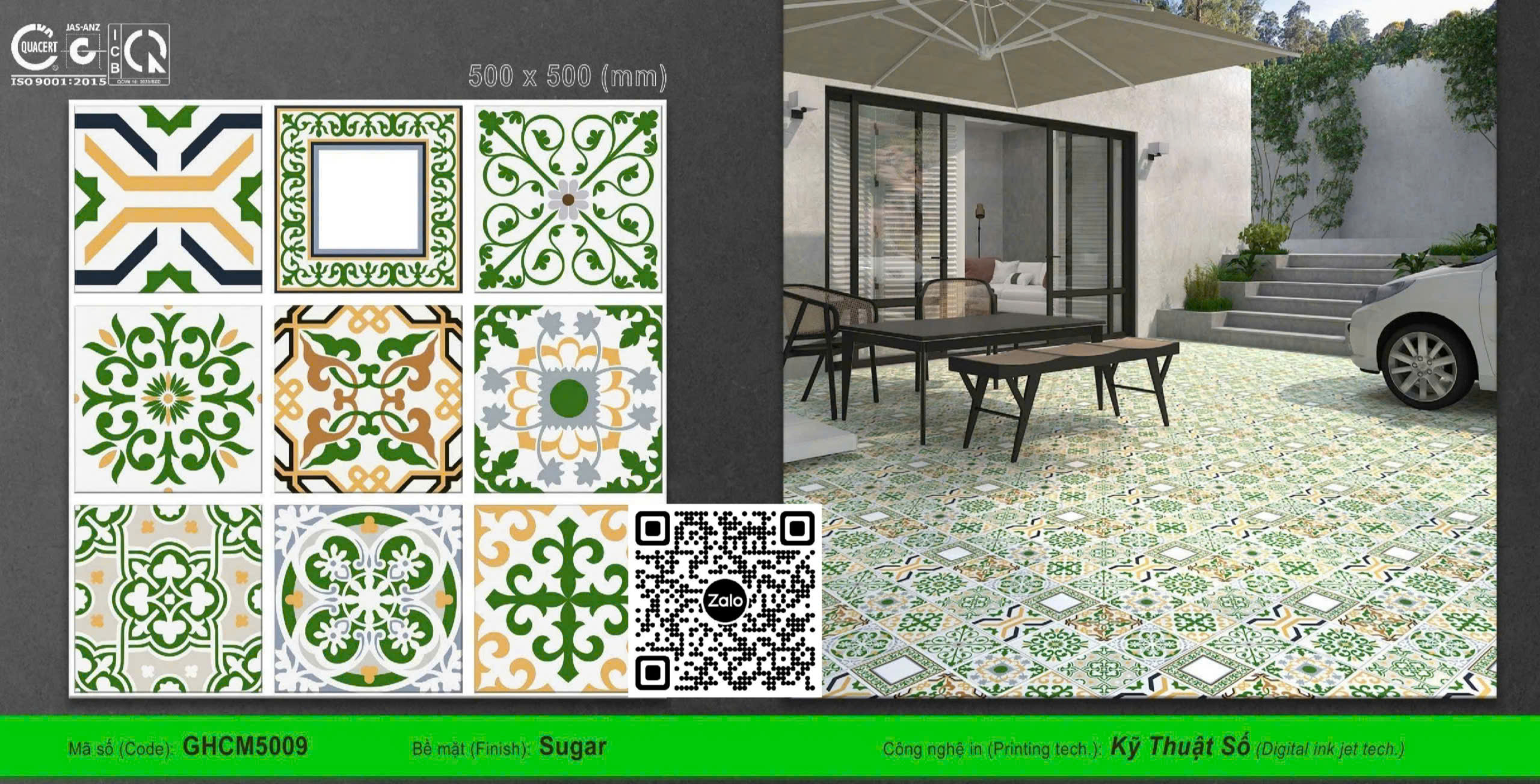 - Gạch Men 50x50 Ốp Lát Sân Vườn có bề mặt mờ - nhám ->> có khả năng chống trơn trượt và chống thấm tốt cho khu vực ẩm thấp của Không Gian Nội Ngoại Thất