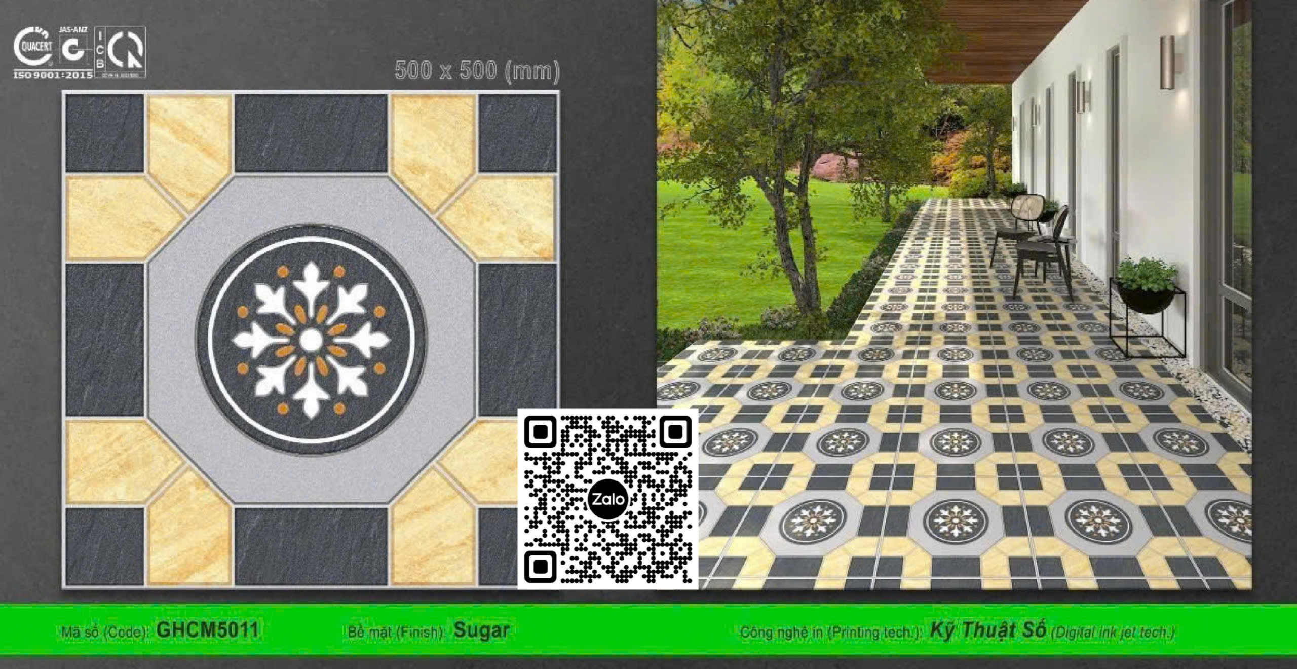 • Gạch Men 50x50 Ốp Lát Sân Vườn có bề mặt mờ - nhám ->> có khả năng chống trơn trượt và chống thấm tốt cho khu vực ẩm thấp của Không Gian Nội Ngoại Thất