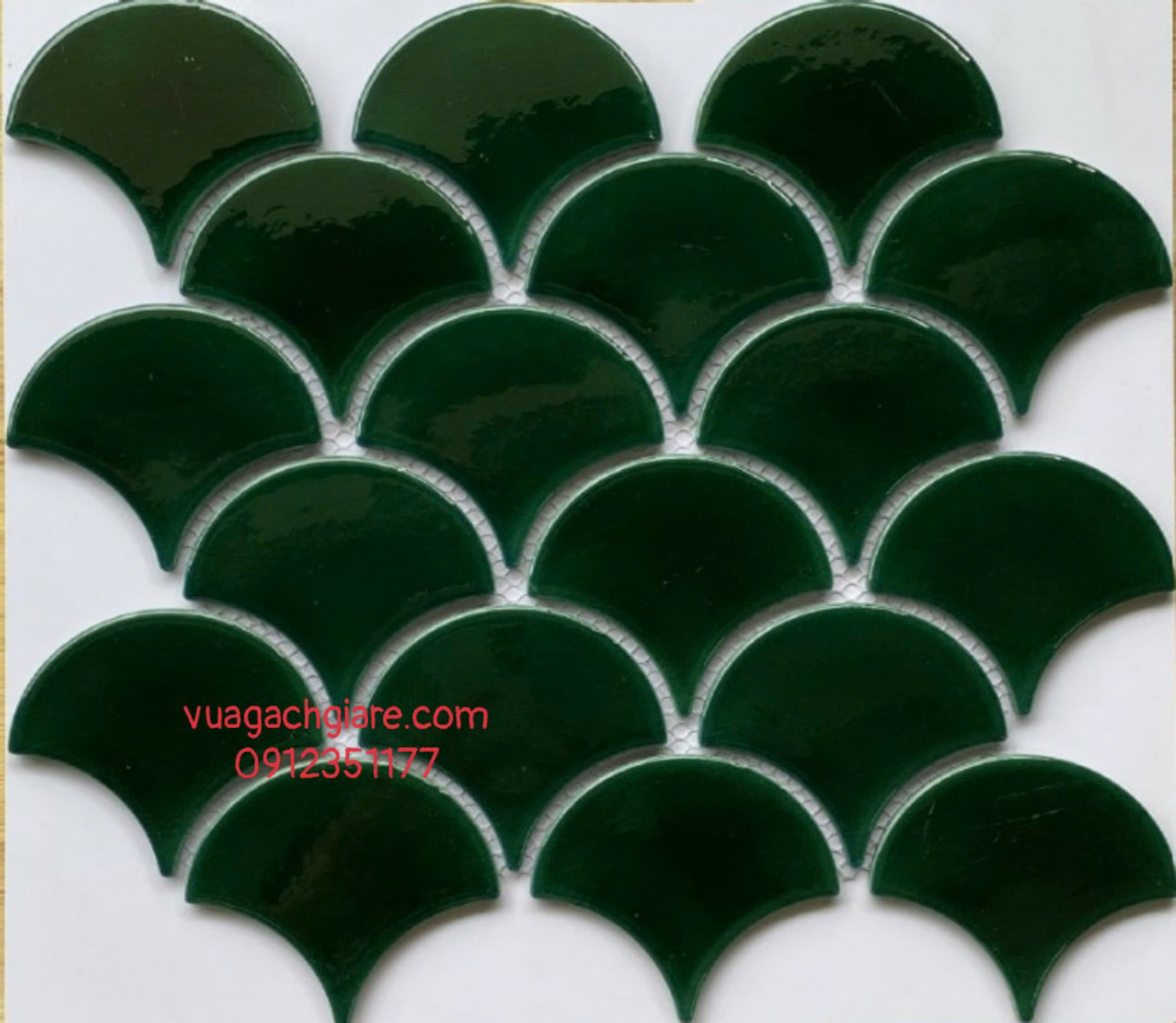 Phối Cảnh Gạch Mosaic Thuỷ Tinh Vỉ 30x30 vảy cá màu xanh lá đậm